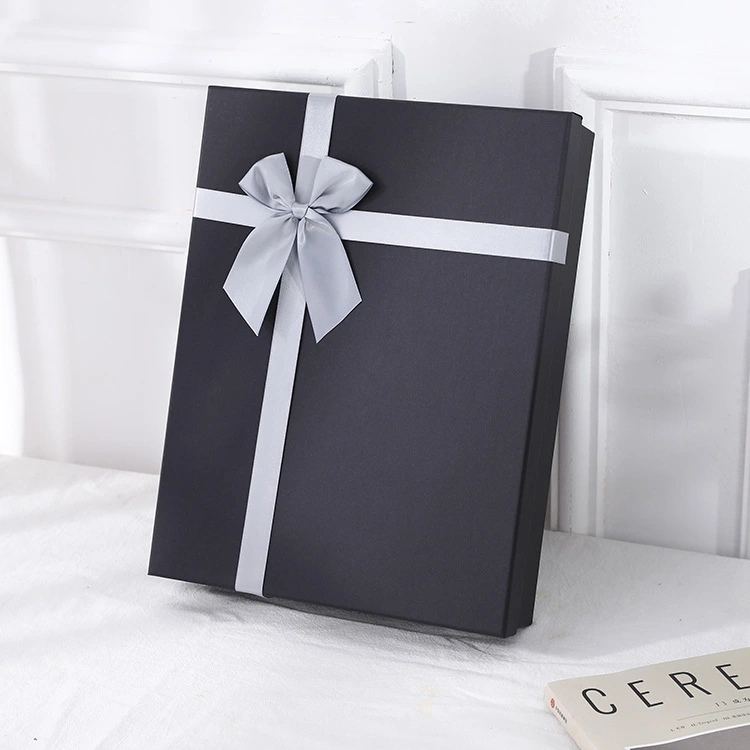 | Materialzusammensetzung: | 1200–1800 g/m² starrer Graukarton Schwarz laminiertes Kunstdruckpapier (mattes Finish) Dekorative Schleife aus Satinband (silber / individualisierbar) |
